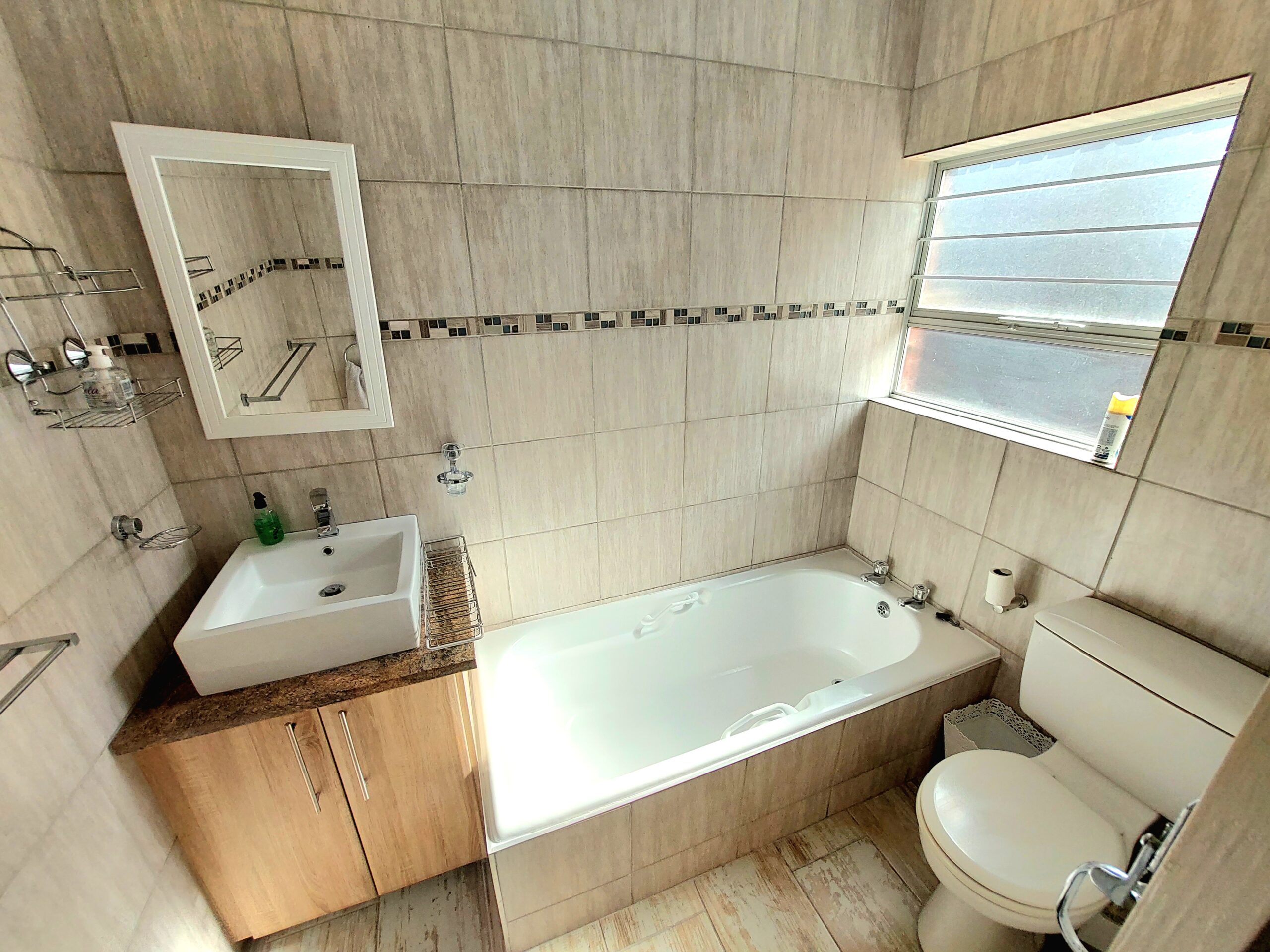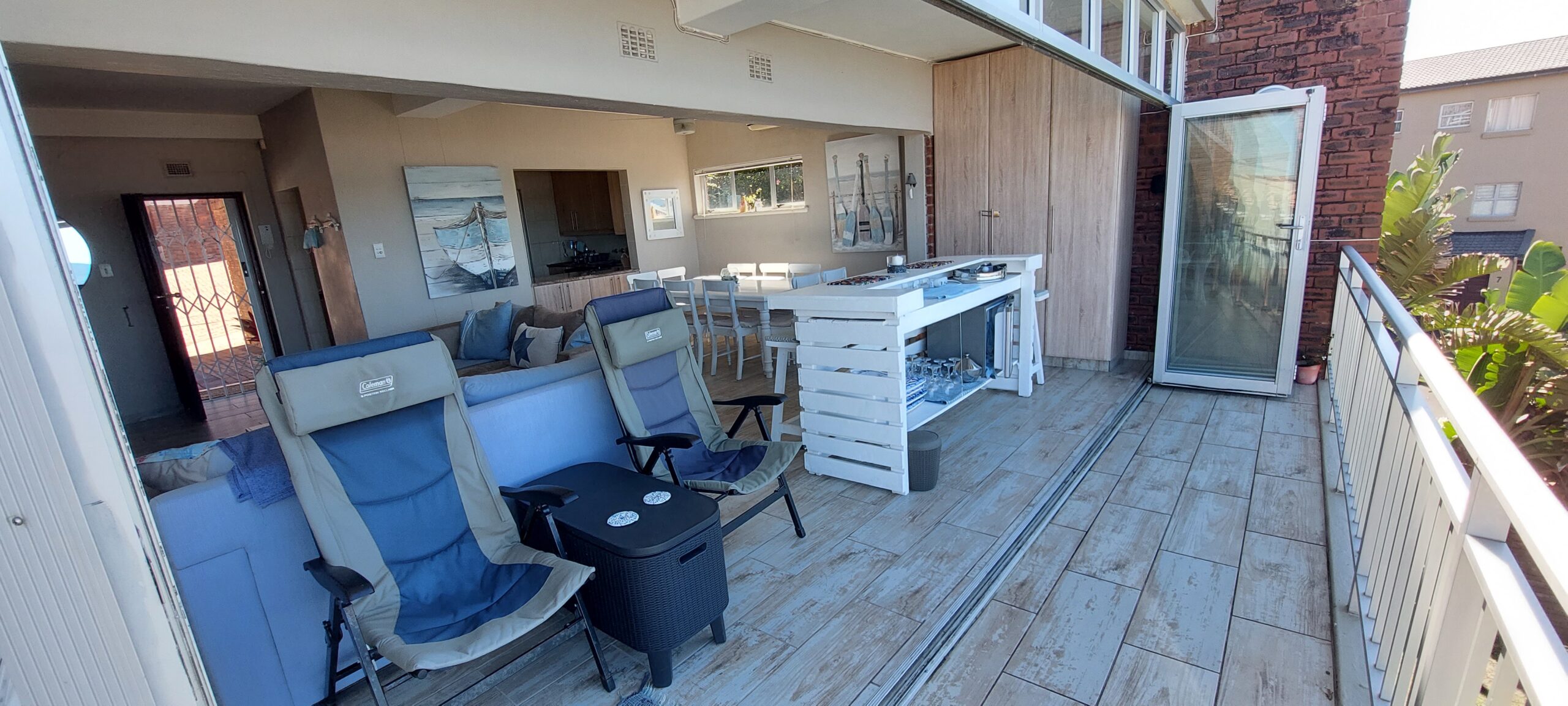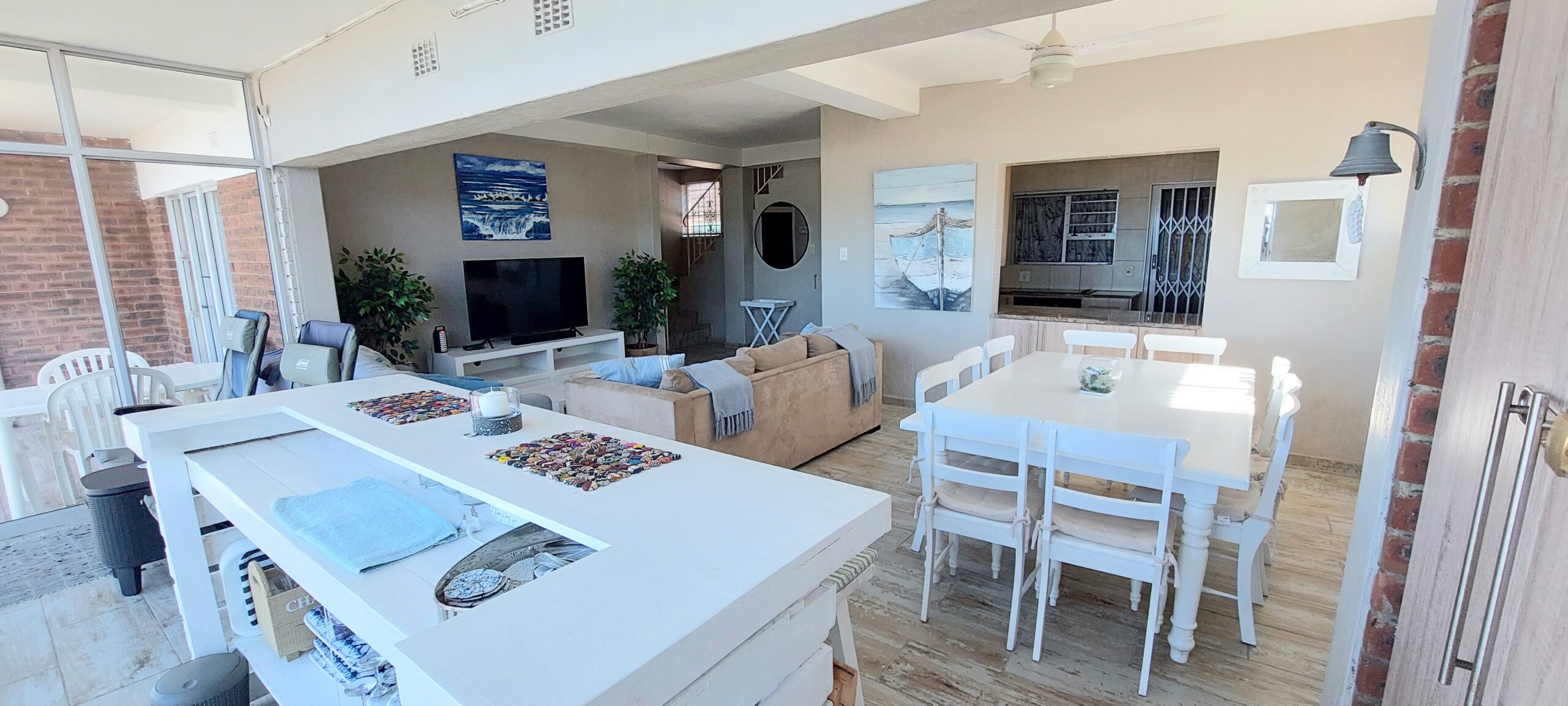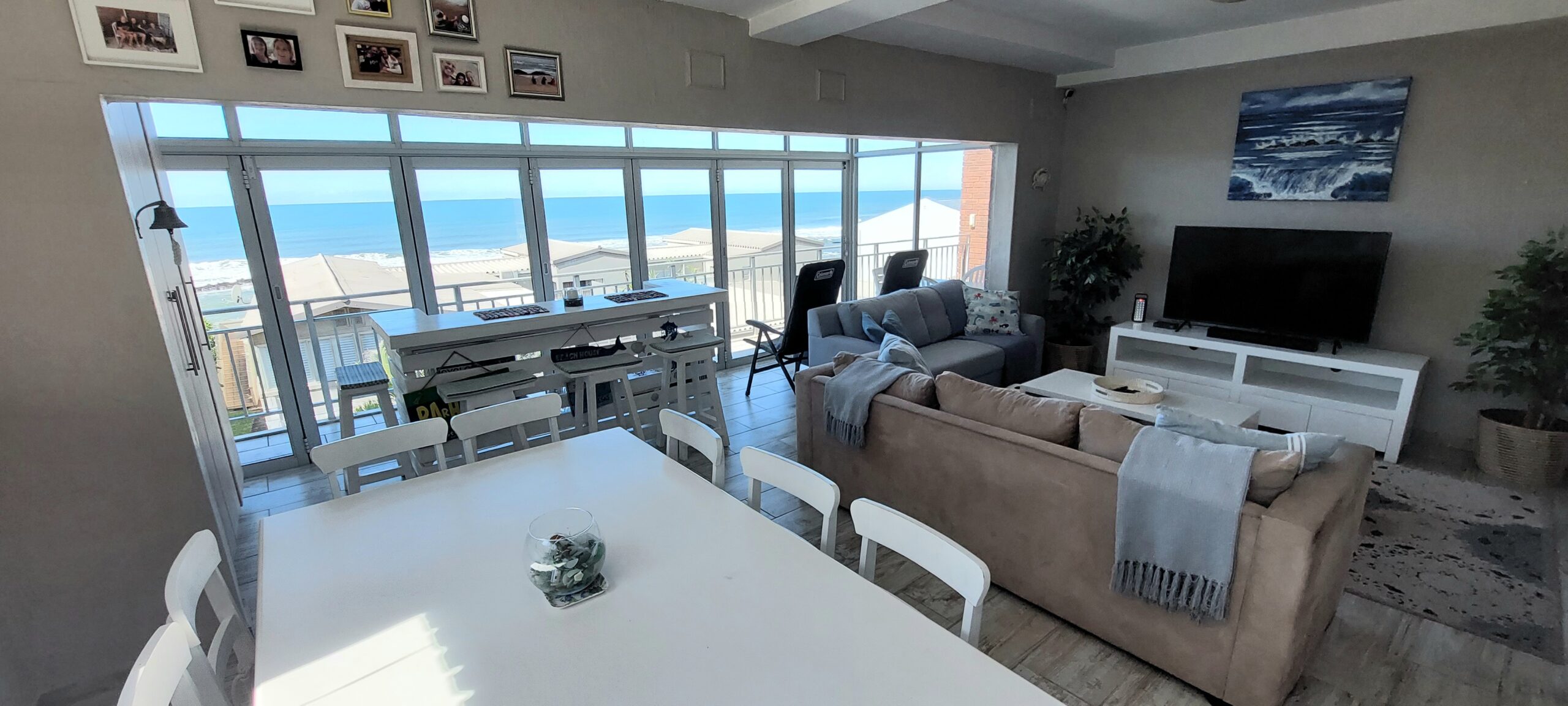 The kitchen is fully equipped for self-catering with a fridge-freezer, stove and oven, microwave, kettle, dishwasher and washing machine. The dining area contains a 10-seater dining table and chairs. The lounge contains 2 couches and a TV with full DStv. Unlimited fibre Wi-Fi is available. The living area has retractable stacker doors that open to a terrace with braai facilities and seating.