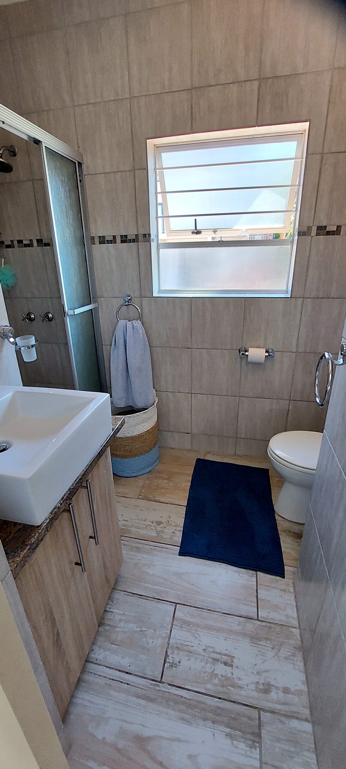 The apartment can accommodate up to 7 guests and comprises 3 bedrooms, 4 bathrooms, and an open-plan kitchen, dining and living area. The first bedroom contains a king-size bed and a shower en suite with a toilet and washbasin. The second bedroom contains 3 single beds and a shower en suite with a toilet and washbasin. The third bedroom contains a queen-size bed. The third bathroom contains a bath, a toilet, and a washbasin. The fourth bathroom contains a shower, a toilet and a washbasin.
