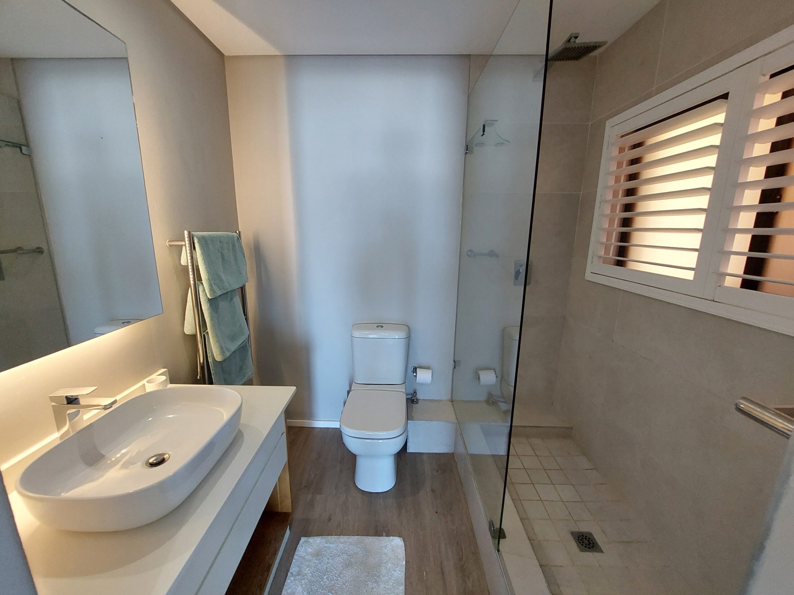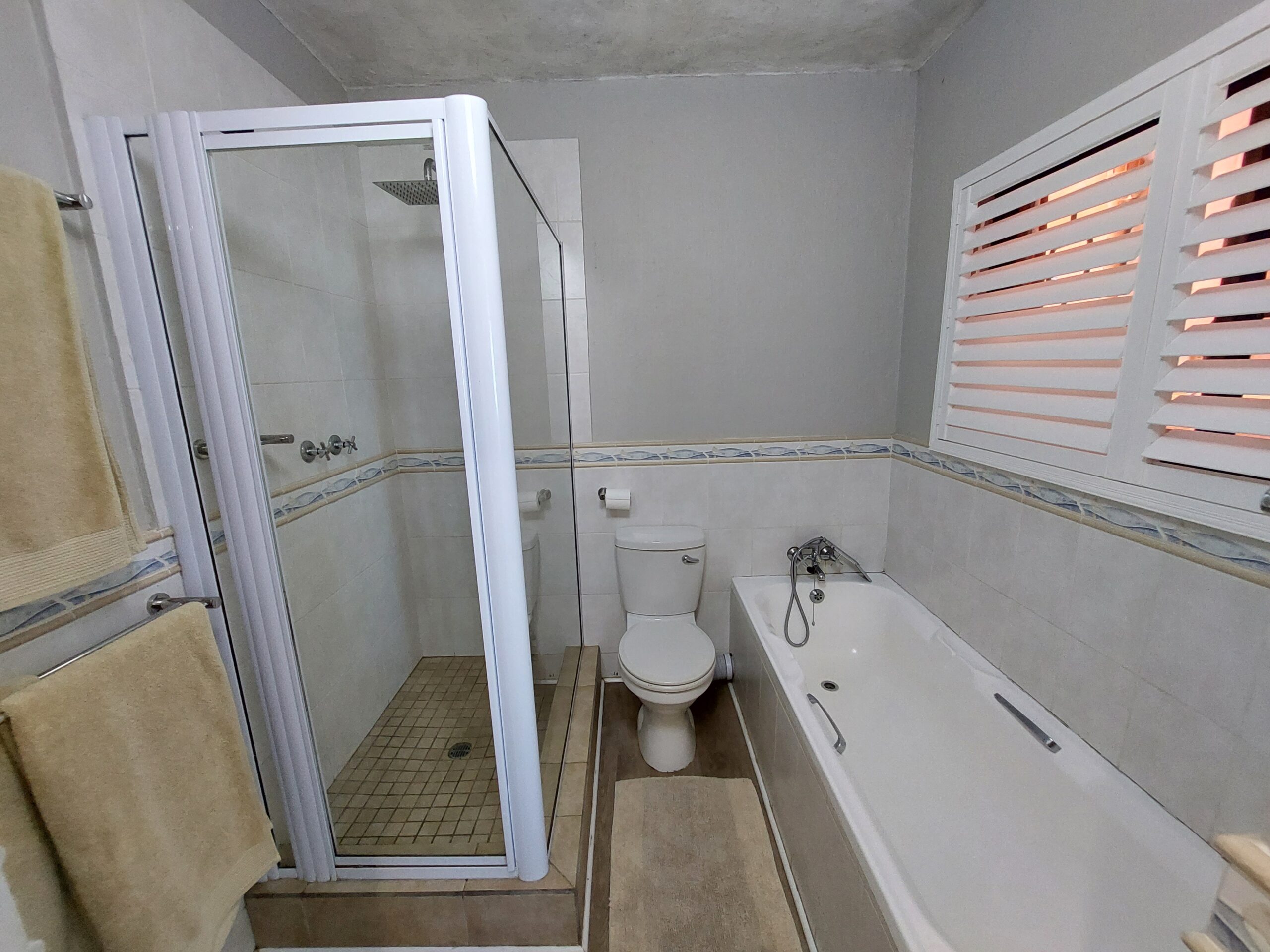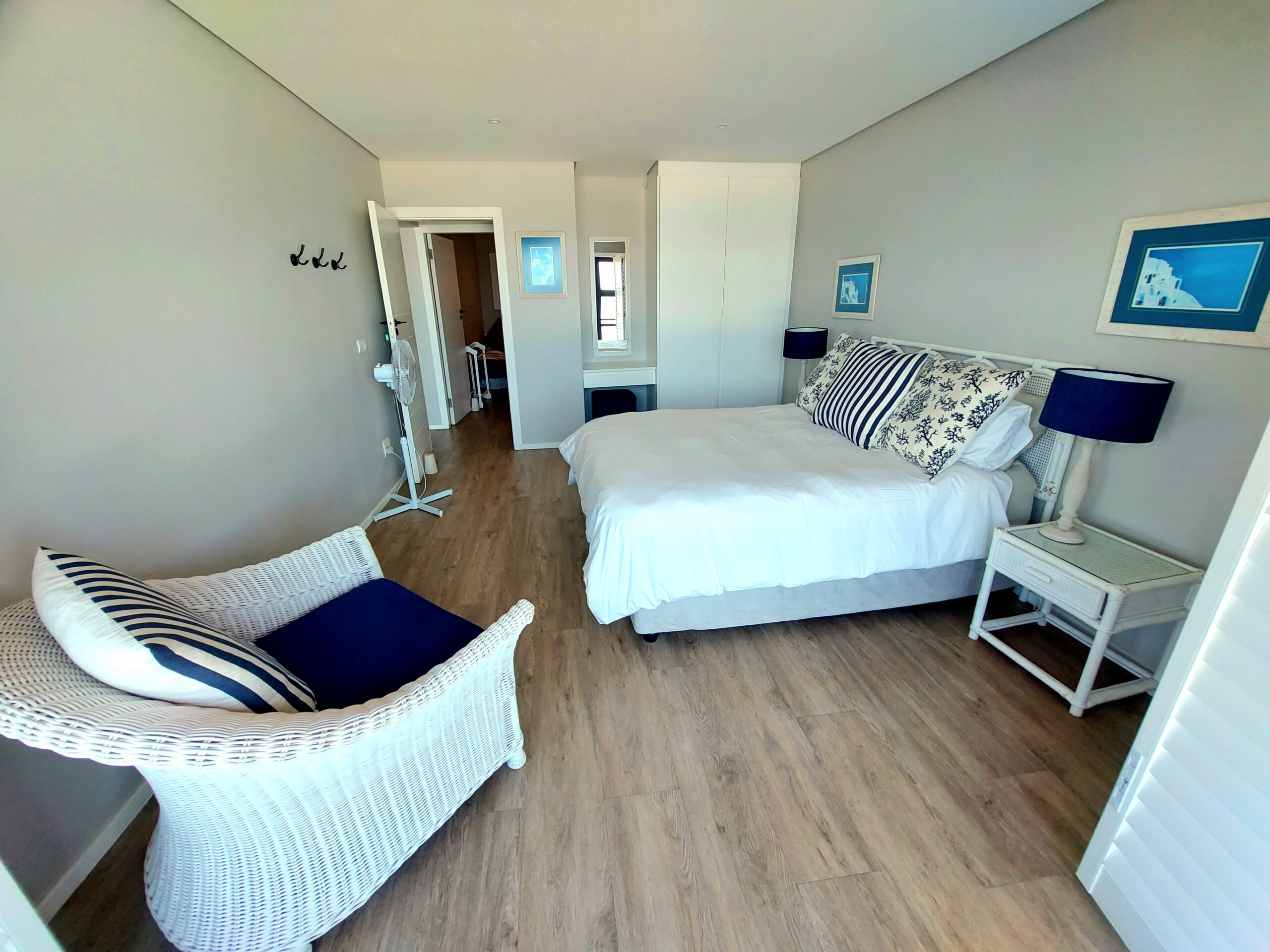 The apartment comprises 3 bedrooms and 2 bathrooms, accommodating 6 guests. The main bedroom is furnished with a queen-size bed and has an en-suite bathroom fitted with a shower. The second bedroom is furnished with a queen-size bed, and the remaining bedroom with a double and single bed. The guest bathroom is fitted with a bath and a shower. Linen, bath, and beach towels are provided.